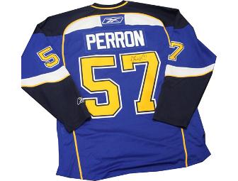 This is your chance to own a jersey autographed by Blues player David Perron. Perron was selected by the Blues in the first round of the 2007 draft. He's quickly become a leading scorer for the Blues, racking up 47 points last season. Be the envy of everyone else at the game in this #57 signed jersey.
