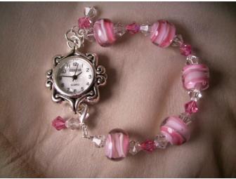 Be still my beating heart! Surrounded by pink and white lampwork beads, the colors of love and live bloom together to bring sparkle to the delicate balance of time. Finished with a clasp on both ends, each 7.5" watch bracelet can be used with other watch faces for a romantic upgrade to your daily wardrobe. (Geneva watch face included may be different than shown.)