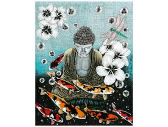 Enchantingly composed and deftly rendered Dragonfly Dream V: Peace and Prosperity at the Fishpond by artist Willow Norris is ready to become part of your internal landscape wherever you call home.