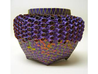 This basket uses unique decorative papers that have been hand painted and then, using a pasta machine, cut into strips. Working over a Nantucket Basket wooden mold employing traditional basketry techniques, these strips are transformed into a colorful vessel embellished with Native American curliques.