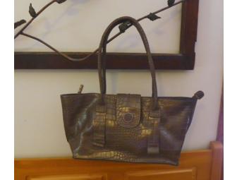 This Emilie M Bag is made of a gun metal faux leather in a crocodile print. This roomy bag has a zippered pocket and a cell phone pocket. The bag closes with a magnetic snap. The inside fabric lining of the bag shows mild wear, but the outside is in beautiful condition.