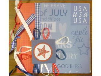 This Independence Day-themed 5.5" square scrapbook album is "recycled" from brown lunchsacks! Just affix your favorite photos for an instant bragbook. These also make great gifts for family, friends, or even as party favors! Completely decorated and embellished, includes pull-out pages for extra photos or journaling.