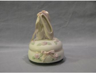 Beautiful revolving music box topped with ballerina slippers. Plays Ballerina Girl.