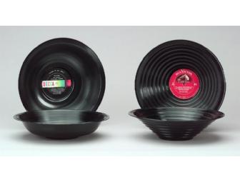 Jeff Davis' bowls, made from vintage 33 rpm vinyl records, put the right spin on entertaining. Use them to serve fruit, pretzels, wrapped candies, or to hold a small bowl of dip surrounded by chips. A mylar seal protects each record label and seals the spindle hole in the center. Do not use them to hold liquids or hot items.