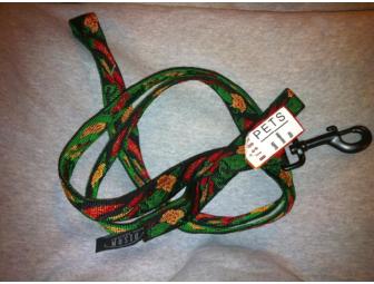 Hot stuff here, watch out! Firey peppers for firey pups. These peppers almost dance right off this collar as they marinate in a cool black and green background, combined with a black snap closure and a looped fabric handle for easy walks :)