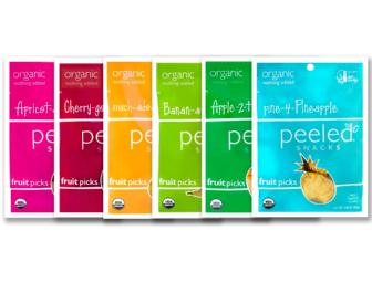 organic dried fruit sampler including 12 single serving packages of cherry, mango, apple, banana, pineapple, and apricot