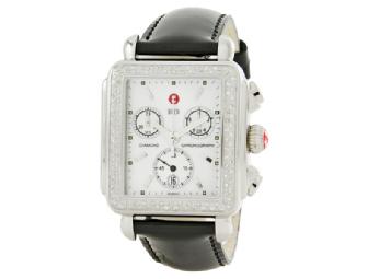 Michele Deco Diamond Watch, features 108 genuine diamond embellished case, mother of pearl dial, chronograph, swiss movement, genuine alligator strap.