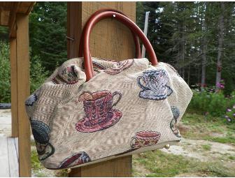 This charming satchel-style women's handbag is made of tea cup-patterned tapestry fabric with full-grain leather appointments.The top has a hinged opening with a zippered pocket inside. Brass feet protect the bag's bottom.