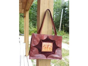 This is bag is by Claudia and made in Italy of genuine chestnut colored leather. The front of the bag has a hand tooled patch surrounded by suede patching and overstitching. It's well made from sturdy leather. It has a magnetic snap top closure and one inside zippered pocket. The bag is used and in excellent condition.