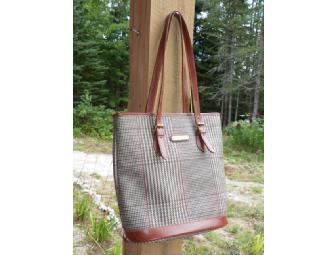 Classic tweed and leather define this Polo Ralph Lauren tote. Crafted from a textured faux leather, printed with a tweed pattern, this tote it lined with cotton and trimmed out in leather with brass tone hardware. The only sign that this tote has been used are some very minor scuffs on the bottom leather trim surrounding the bottom of the bag. It's in impecable condition.