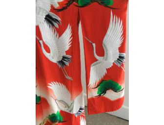 A red silk wedding kimono with elaborate embroidery of stylized pine tree and white herrons.