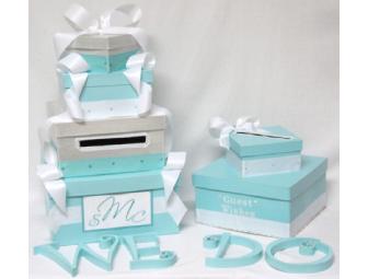 This package includes a 4 tier Creative Custom Card Box with Swarovski Crystal Accents and a stock logo monogram plaque, WE DO cake table letters to decorate your cake table or sweetheart table, and a "Guest Wishes" guest book alternative box in which guest leave good wishes and blessings for the couple.