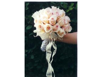 Handtied Bridal Bouquet of 24 roses (your choice of color) with minimal foliage collar and braided ribbon stemwrap with pearl or crystal accents on the handle along with a matching boutonniere.