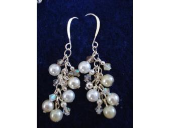 Pearl and crystal earrings handmade by Angellove Creations. This earring set is made with Swarivski Pearls and crystals and sterling silver beads. The earring hook is also sterling silver.
