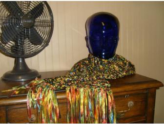 Need a long funky scarf to make a statement? This might be the one for you. Knitted with black cotton yarn and earth toned ribbon, this extra long scarf also has tassels for added length. With the ribbon knitted in, this is an extra thick scarf.