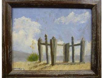 "This beautiful painting is a gorgeous view of magnificent hills and a charming fence. The blue skies look real. This painting has such beauty in its uniqueness. It is to die for, so bid right away."