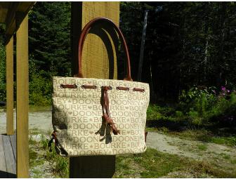 This Dooney and Burke bag is made from a heavy duty canvas like fabric patterned with the Dooney and Burke name. It has leather trim and a top magnetic snap closure. Inside features four slip pockets. This bag shows its previous use in the marks on the inside bottom of the bag and on the outside bottom of the bag where the seams are a bit discolored.