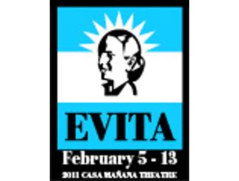 Certificate for two (2) complimentary tickets to be redeemed for the Saturday February 5, 2011 performance of Evita at Casa Manana Theatre. Show begins at 8:00pm.