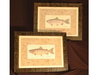 Pair of framed fish prints - one rainbow trout and one cutthroat trout. Size 14" x 18".