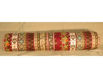 Brown, hot pink, lime green, orange multi-fabric large bolster for a full- or queen-size bed.