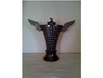 Hand-crafted black ceramic lidded jar made by ceramic artist Fern Bealmear. This one of a kind piece features a sleek black body with white polka dots, grey wings, and adds a fun flair with the addition of a rabbit head on the lid.