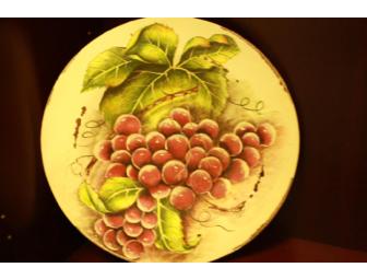 This wooden decorative distressed plate features grapes on the vine design.