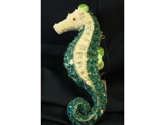 This large (11'') seahorse ornament is brilliantly colored and delicately decorated with beads and sequins. To accompany this seahorse ornament is a set of 8 lovely ''element'' note cards with a golden embossed seahorse on the front including envelopes.