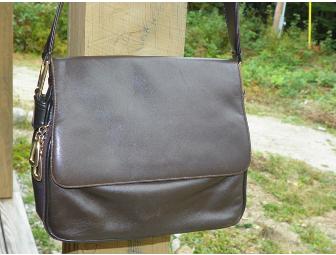 Get organized in this super functional genuine leather bag with gold trim hardware. Magnet front snap close flap opens to three pocket section with credit card divider. Open middle section. Third interior section zipped pocket. Bach of bag has yet another roomy zipped pocket. Classic good looks with amazing function.