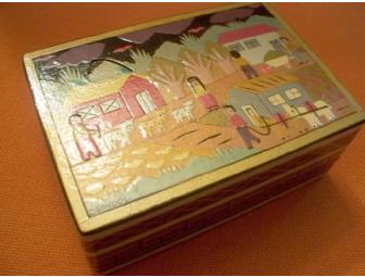 This is a great wooden puzzle box from Columbia. Hand-painted picture of a village on the front, and a beautiful pattern on the sides in gold & copper tones.