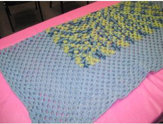 Lovely blue blanket, hand made with love, 52" x 62". Cuddle up underneath with a good book and enjoy a quiet afternoon.