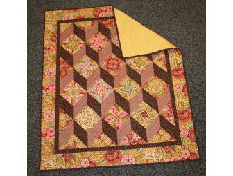 Hand Made, all cotton, machine washable, reversable lap quilt. Fall pattern and colors,patchwork on one side, solid gold on the other trimmed in brown. Very soft and comfortable.