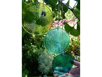 We offer this lovely Chartres-style labyrinth suncatcher. to brighten your windows. Currently available in two colors, apple green, and teal, they measure 4" across. Made from 100% recycled glass and very lightweight, ready-to-hang by a hemp-fiber cord decorated with glass beads of dark blue, light purple and aquamarine. A perfect way to reuse, recycle and support a worthy cause. These make great gifts!