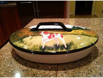 Up for auction is this beautiful hand painted casserole dish. The dish measures 15" long, 10" wide and 3" deep. It is off-white with dog paw prints on inside of the dish. The lid shows an orange and white Brittany standing in a field.