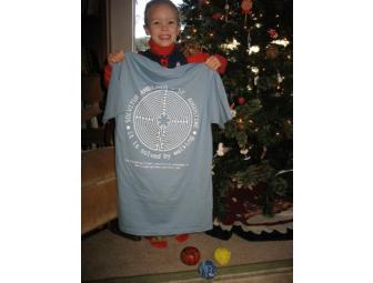 Sky blue 100% cotton tshirt with Chartres labyrinth on back, and the words: SOLVITUR AMBULANDO it is solved by walking. Your choice of size: M, L, XL or XLT.