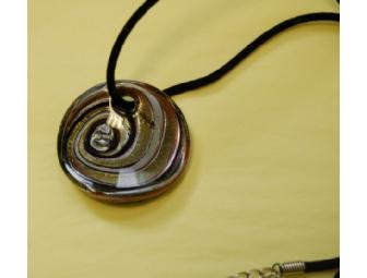 Just what you might need to put the finishing touch on an outfit. This circular, metallic colored glass necklace is a beautiful addition to any jewelry collection!
