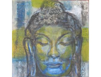Carole says: "This mixed media piece is meant to bring peace and tranquility to any living space. This 10"x10" original mixed media piece is done on a deep cradled panel (wood) and is ready to hang. The dictionary definition of "Buddha" is transferred on to the left hand side of the image and some handmade Asian script papers appear on the right. The piece is textured and has layers of paint in blues and greens. The piece begs the question: Who is the Buddha? How Do you define him in your life?"