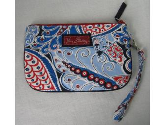 Vera Bradley clutch purse is Seaside print (retired) in red, white, and blues. This small purse has a zipper closure, front zipper pocket and removable wrist strap. Purse measures 8x5 inches.