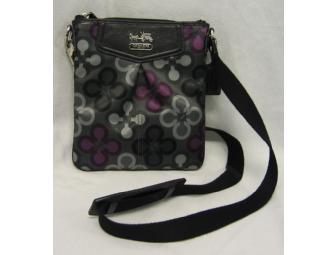 New from Coach is this Madison Clover print. The newest Op Art print shines on this small silhouette, with hands-free styling perfect for busy days and nights. Features include: Dotted Op Art print fabric with leather trim, inside multifunction pocket, outside back pocket, zip-top closure, fabric lining, 45'' adjustable strap. Purse measures 7.5 x 8.5 inches.