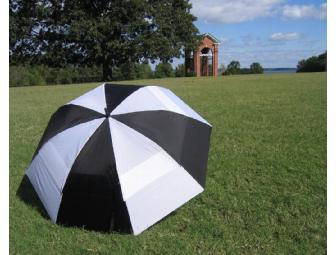 This black and white Leighton Windefyer golf umbrella comes with its own sleeve for safe storage. The umbrella is classic golf-sized with a 64-inch arc. Other features include manual operation, a double overlapping canopy which funnels wind to prevent the umbrella from inverting, genuine wood handle, lightweight yet durable fiberglass shaft and ribs. Made of 100% nylon. Preprinted with the logo ''Super Polysteel.''