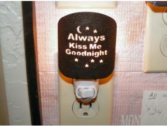 Rustic dark brown metal nightlight with the words, "Always Kiss Me Goodnight".