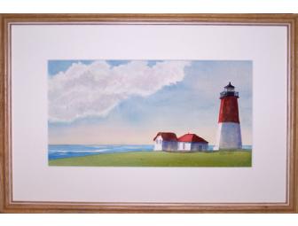 This 12" x 18" original watercolor by Kristi Johnston is a lovely representation of the familiar Rhode Island Lighthouse at Point Judith. With storm clouds lifting away, the afternoon light seems to cast a glow on the lighthouse.