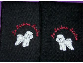 A pair of mini waffle weave kitchen towels embroidered with one of our unique Bichon designs: Bichon Bistro.