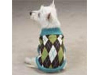 A classic sweater pattern for light-weight winter style! Ribbed neck, sleeves, and trim provide a secure fit, and the black and green colors offer a great contrast to your fluffy white Bichon. Made from machine-washable acrylic yarn; Medium size (16” length, 20-25” chest). Sorry no Bichon photo available – sweater is brand-new, still in the package.