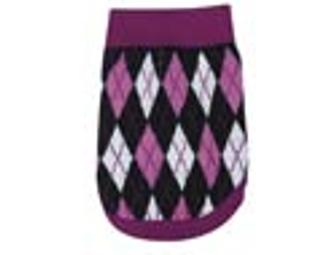 A classic sweater pattern for light-weight winter style! Ribbed neck, sleeves, and trim provide a secure fit, and the pink and black colors offer a great contrast to your fluffy white Bichon. Made from machine-washable acrylic yarn; Medium size (16” length, 20-25” chest). Sorry no Bichon photo available – sweater is brand-new, still in the package.
