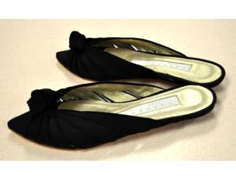 These exquisite black flats are jazzed up with open toes, accentuated with a knot at the top. With a shimmery gold lining these flats will be a hit anywhere you go! They are size 38 (7 1/2)