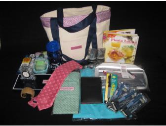 This bag includes: Vineyard Vines Classic Tote, Vineyard Vines Men's Tie, Vineyard Vines Nor'easter Dobb Kit, Vineyard Vines knit boxers, Vineyard Vines tidal tanutop, Fiesta Latina cookbook, Dooney & Boorue Leather Passport case, Lux, Bond & Green Women's Cuff Bracelet, Waterford Crystal Clock and assortment of Pilot Pens and Schick razors.