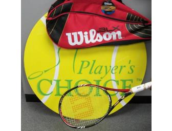 "Do any of you out there play tennis? Have you sometimes lost your equipment? Bid on this tennis package. This brilliant combination includes a Wilson BLX Khamsin Five racquet, a Wilson BLX Tour Bag, and a certificate for the stringing of a racquet. This lovely sports package is only available here, so bid on it right away!"