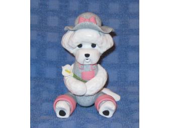 Hand sculpted of polymer clay and signed on the bottom by the artist. This lovely girl Bichon holds a Calla Lily in her paws. She is wearing light gray and pink overalls and a matching hat with a pink bow. Detailing is so good that you can see the buttonholes. There are 3 pieces of felt on the bottom to help protect the figurine and your furniture. The figurine measures 4.25" tall, 2.5" wide and 2.5" deep.