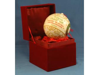 Ceramic Christmas ornament with religious inscription about the meaning of the Christmas Wreath.