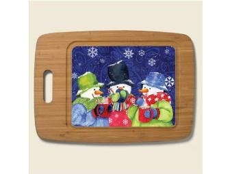 Snowman trio Christmas gourmet bamboo prep and serving cutting board by Highland Graphics. Food safe and easy clean up. Hand wash with warm water and soap. Size 11" x 15".